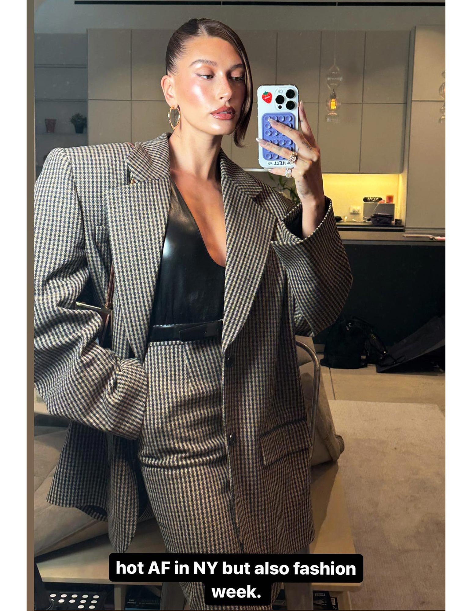 Hailey Bieber risked sweating up a storm — in the name of fashion — when she dared to wear a thick suit in 90-degree weather during New York Fashion Week. Bieber, 26, showed off her outfit via Instagram on Thursday, September 7, which included an oversized brown checkered blazer and a matching skirt. She teamed